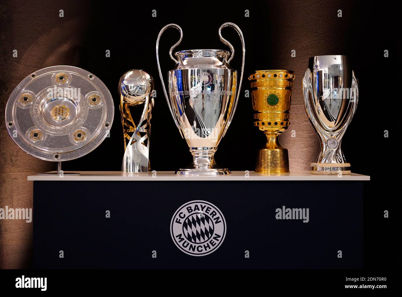 Munich Germany December 17 Picture Shows The Fc Bayern Munich Trophies The Club Won In The 2019 2020 Season Placed On The Stage For The Live Stream Of The Fifa The Best